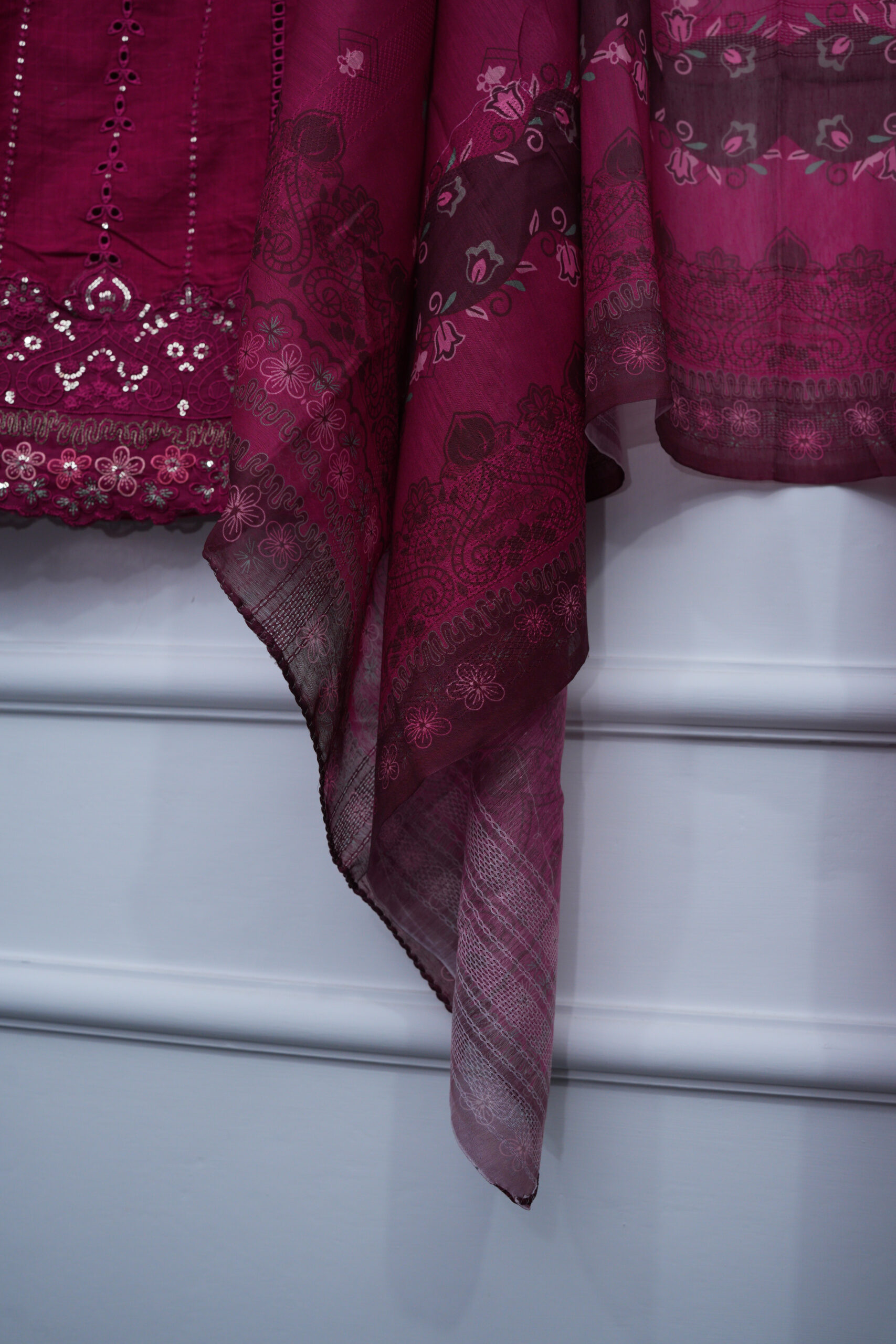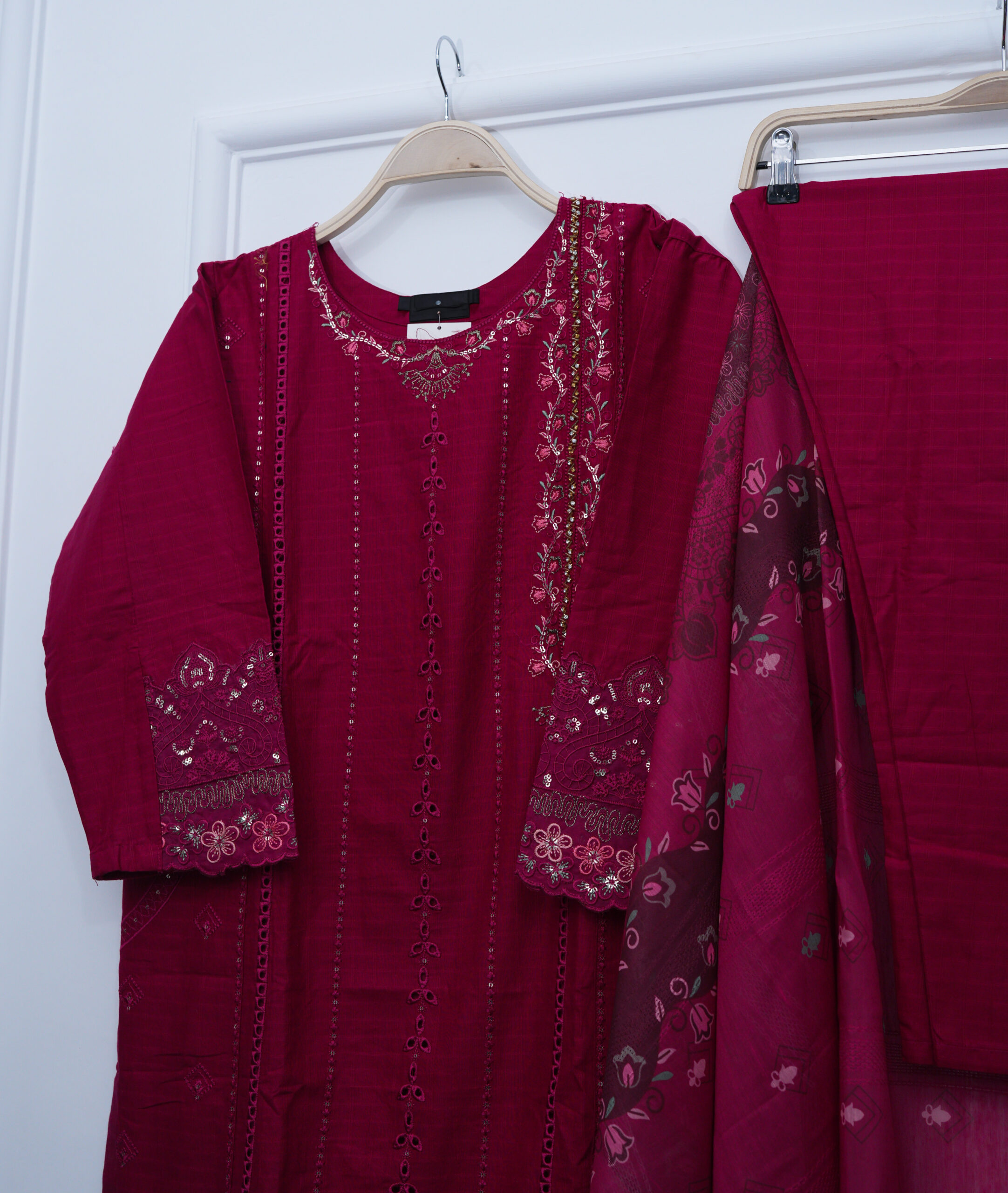 Vibrant shocking pink embroidered shirt paired with matching trouser and lightweight cotton net dupatta. Crafted from breathable cotton fabric with a flattering 42-inch length, available in sizes M and L.